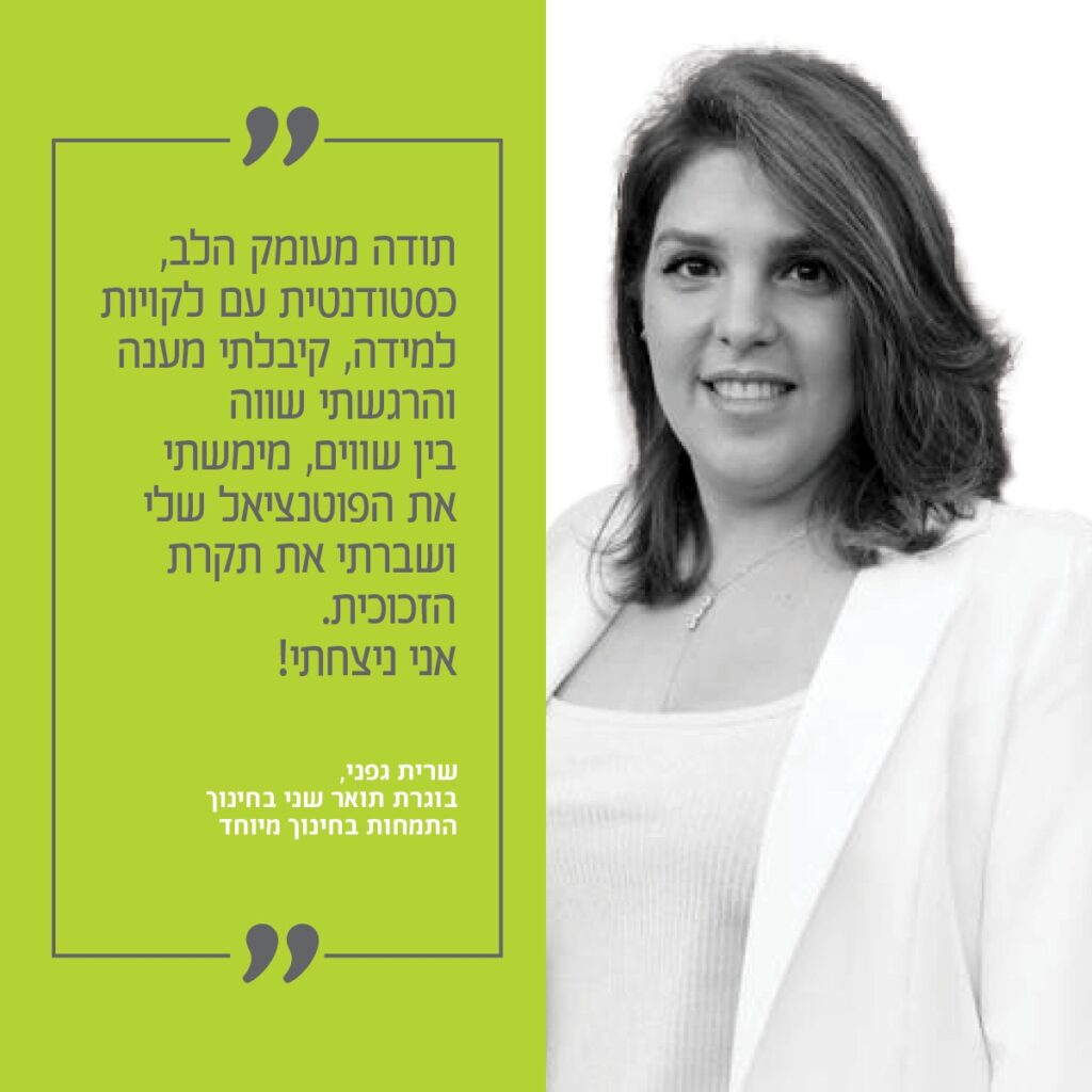 ובנימה אישית, תודה מעומק הלב, סגל יקר, על כך שכסטודנטית עם לקויות למידה קיבלתי מענה והרגשתי שווה בין שווים, ממשתי את הפוטנציאל שלי ושברתי את תקרת הזכוכית.