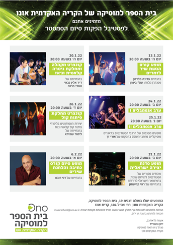 Ono Academic College’s School of Music welcomes you to attend the concert recitals of its music students in the following courses in the months of January and February 2022.