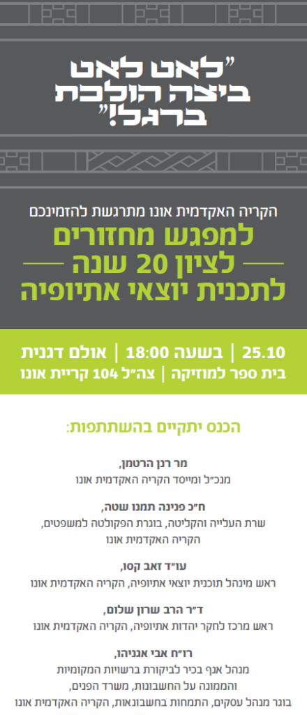 Ono Academic College held a participant reunion celebrating 20 Years of the Program for the Advancement and Integration of Ethiopian-Israeli Students. The event included remarks by: