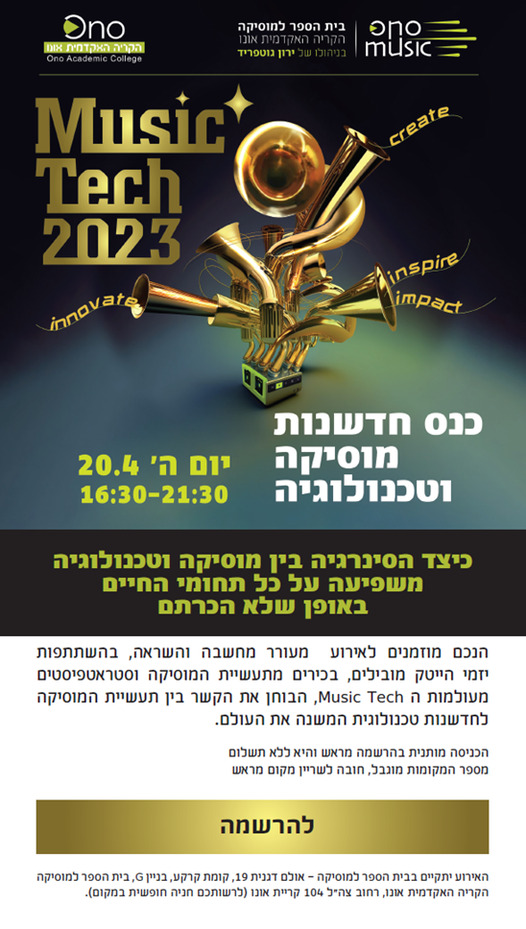 Ono Academic College will host a conference on “Music and Technology Innovation” on Thursday 20.4 from 16:30 till 21:30. The event will take place at the Music School in Dannit Hall 19.