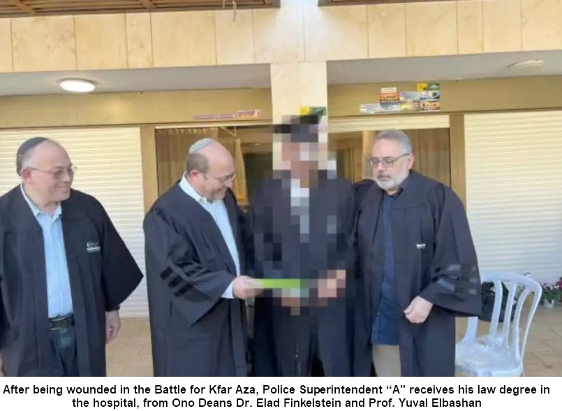 Israel Today published an article about a recent Ono graduate entitled, “A hero with a gown: the Deans surprised Police Superintendent “A” who was wounded in the Kfar Aza battle, and awarded him his law degree in the hospital.”