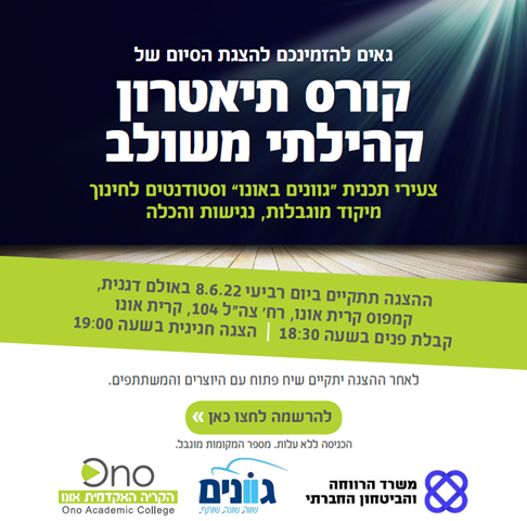 Ono Academic College, together with the Gvanim )Diversities) non-profit organization and Israel’s Ministry of Welfare and Social Security, invites you to course capstone performance of the course “Integrated Community Theater” being studied by members of the “Gvanim Youth” program and students in the School of Education focusing on disabilities, accessibility and inclusion.