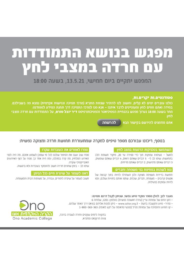 In light of the fighting that has recently erupted in Israel, Ono Academic College has organized a Seminar on Coping with Stress During Times of Conflict.  The college has also compiled a list of tips for people feeling anxiety and mental distress.