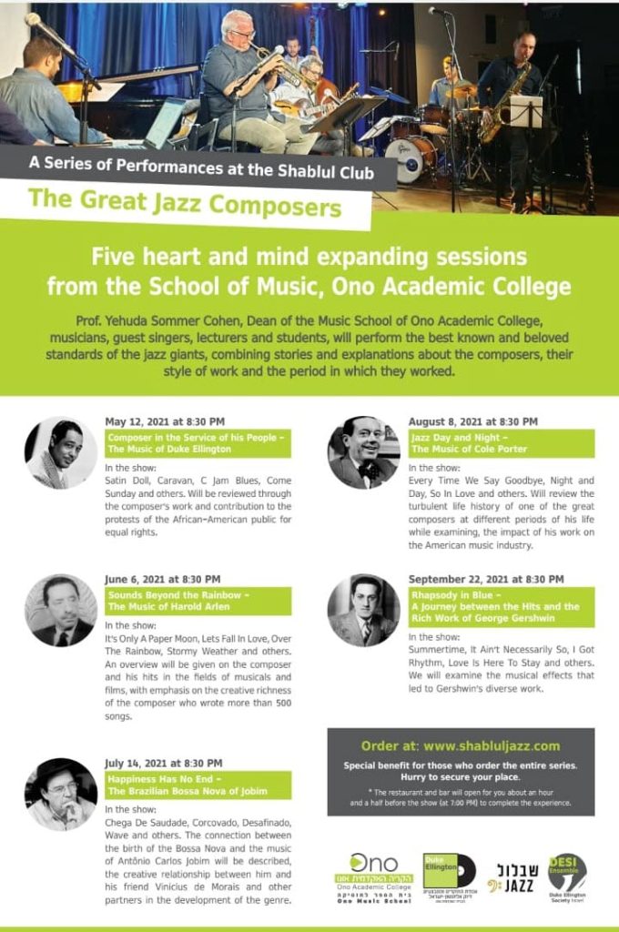 In the summer of 2021, Professor Yehuda Sommer Cohen, Dean of Ono Academic College’s School of Music hosted a concert series in which he and other Israeli artists performed the best-loved standards of jazz giants while presenting musical explanations and behind the scenes stories about the composers.