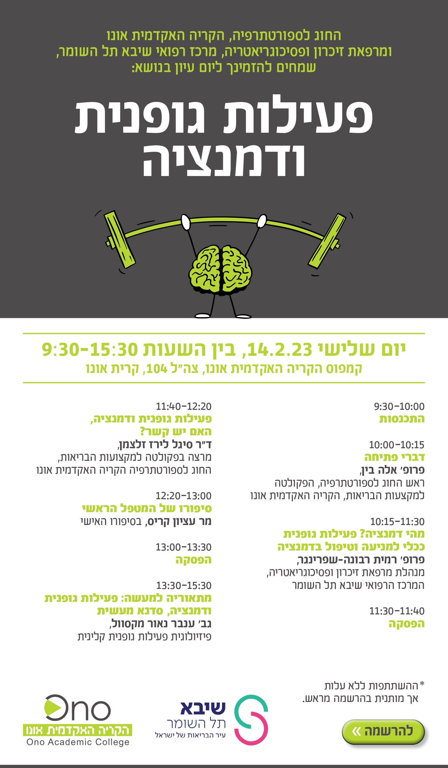 החוג לספורטתרפיה, הקריה האקדמית אונו ומרפאת זיכרון ופסיכוגריאטריה, מרכז רפואי שיבא תל השומר, שמחים להזמינך ליום עיון בנושא: