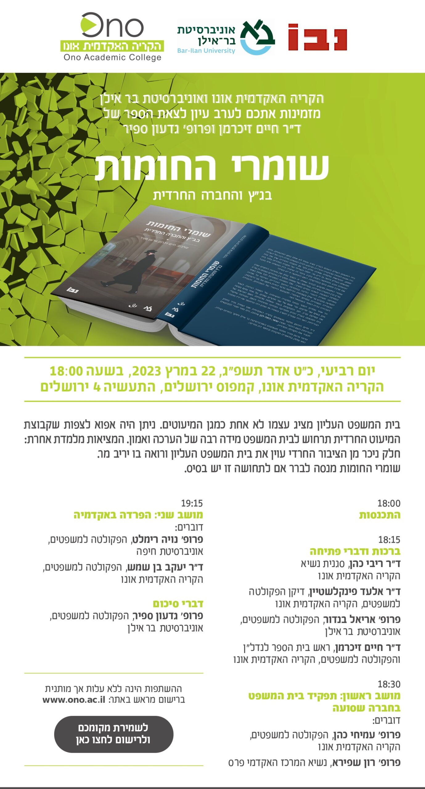 הקריה האקדמית אונו ואוניברסיטת בר אילן מזמינות אתכם לערב עיון לצאת הספר של ד"ר חיים זיכרמן ופרופ' גדעון ספיר