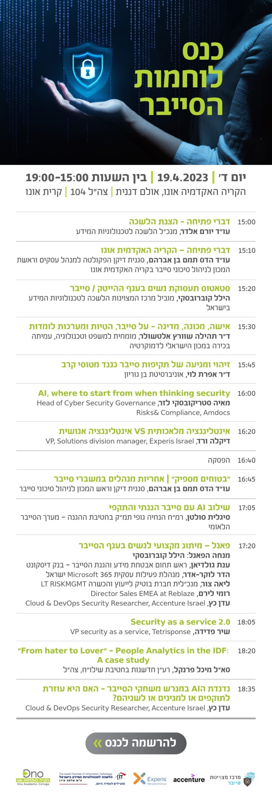 - 15:20 סטאטוס תעסוקת נשים בענף ההייטק / סייבר הילל קוברובסקי, מוביל מרכז המצוינות הלשכה לטכנולוניות המידע בישראל