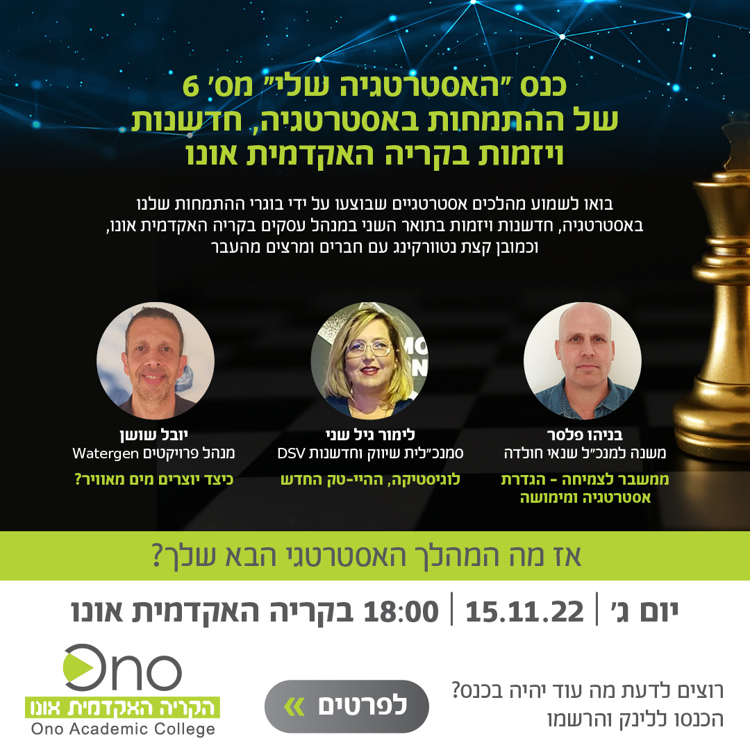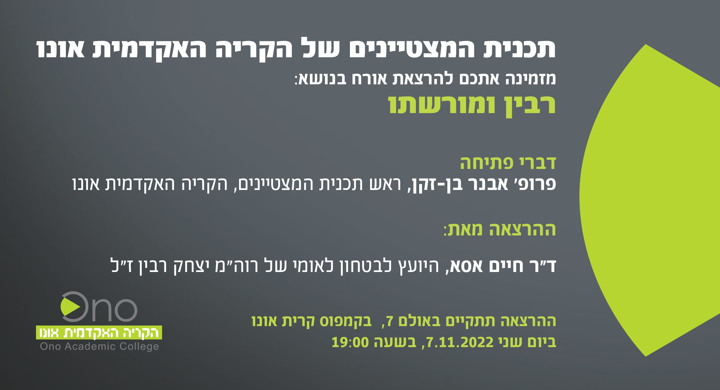 תכנית המצטיינים של הקריה האקדמית אונו מזמינה אתכם להרצאת אורח בנושא: רבין ומורשתו דברי פתיחה - פרופ' אבנר בן-זקן, ראש תכנית המצטיינים, הקריה האקדמית אונו ההרצאה מאת: ד"ר חיים אסא, היועץ לבטחון לאומי של רוה"מ יצחק רבין ז"ל ההרצאה תתקיים באולם 7, בקמפוס קרית אונו ביום שני 7.11.2022, בשעה 19.00