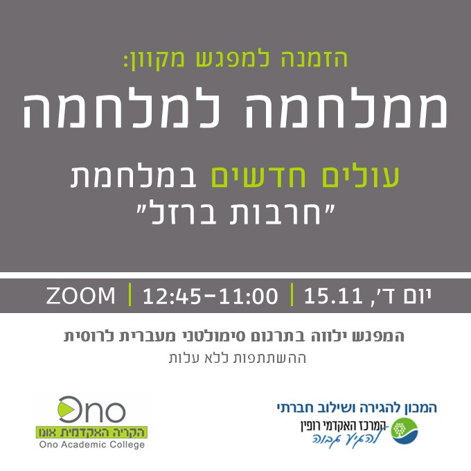 הזמנה למפגש מקוון. ממלחמה למלחמה תכנית המפגש 11:00-11:10 - דברי פתיחה - ד״ר סבטלנה צ׳אצ׳שווילי בולוטין - ראש המכון להגירה ושילוב חברתי, המרכז האקדמי רופין. 11:10-11:25 - ממלחמה למלחמה - עולים חדשים במלחמת ״חרבות ברזל״ •ד״ר רוית תלמי-כהן, הקריה האקדמית אונו. •ד״ר סבטלנה צ׳אצ׳שווילי-בולוטין. 11:25-11:30 - הפסקה 11:30-12:30 - פאנל בנושא עולים חדשים במלחמת ״חרבות […]