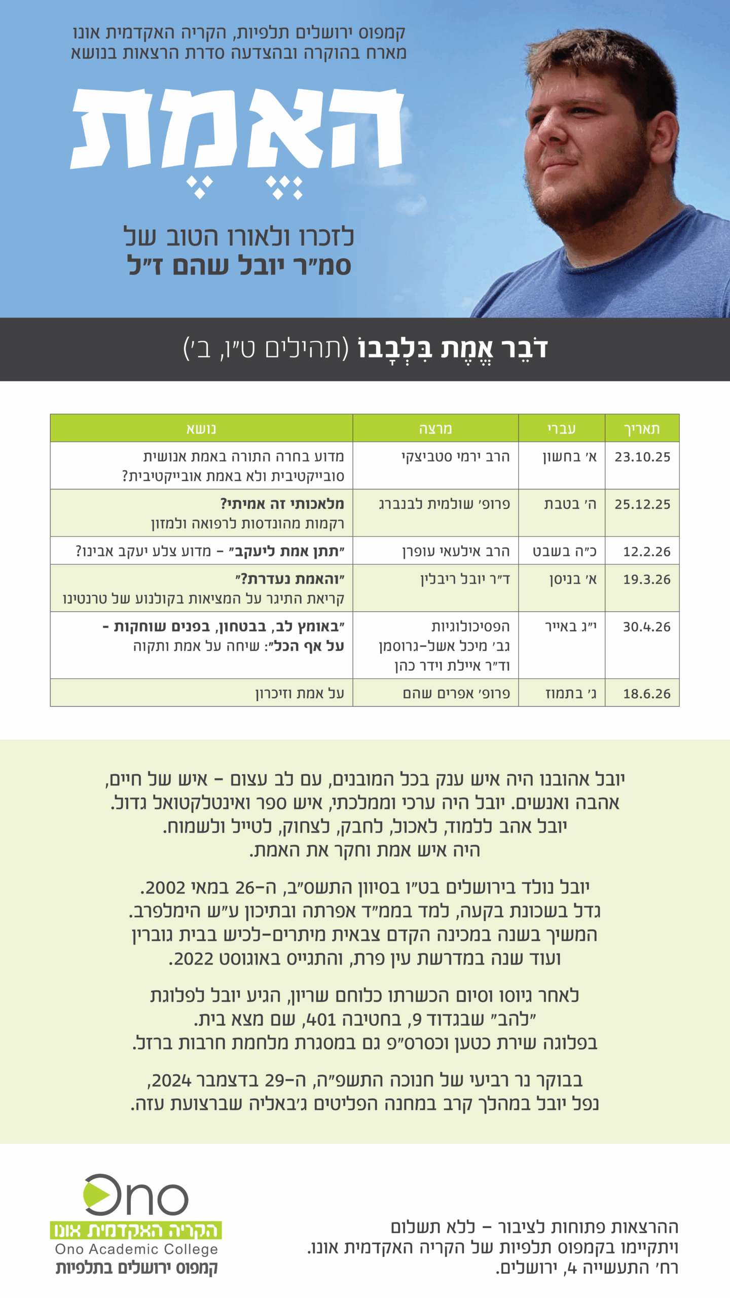 קמפוס ירושלים תלפיות של הקריה האקדמית אונו פותח את שעריו לציבור הרחב ומזמין לסדרת הרצאות ייחודית וערכית בשם "האמת", אשר תוקדש לזכרו ולאורו של סמ"ר יובל שהם ז"ל, לוחם פלוגת "להב" בחטיבה 401, שנפל במלחמת "רבות ברזל", במהלך קרב בג'באליה ביום נר רביעי של חנוכה, כ"ט בכסלו תשפ"ה (29.12.24).