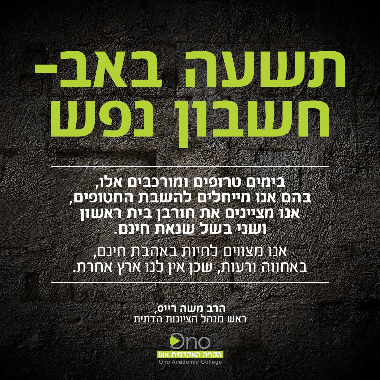 בימים טרופים ומורכבים אלו, בהם אנו מייחלים להשבת החטופים, אנו מציינים את חורבן בית ראשון ושני בשל שנאת חינם. אנו מצווים לחיות באהבת חינם, באחווה ורעות, שכן אין לנו ארץ אחרת.